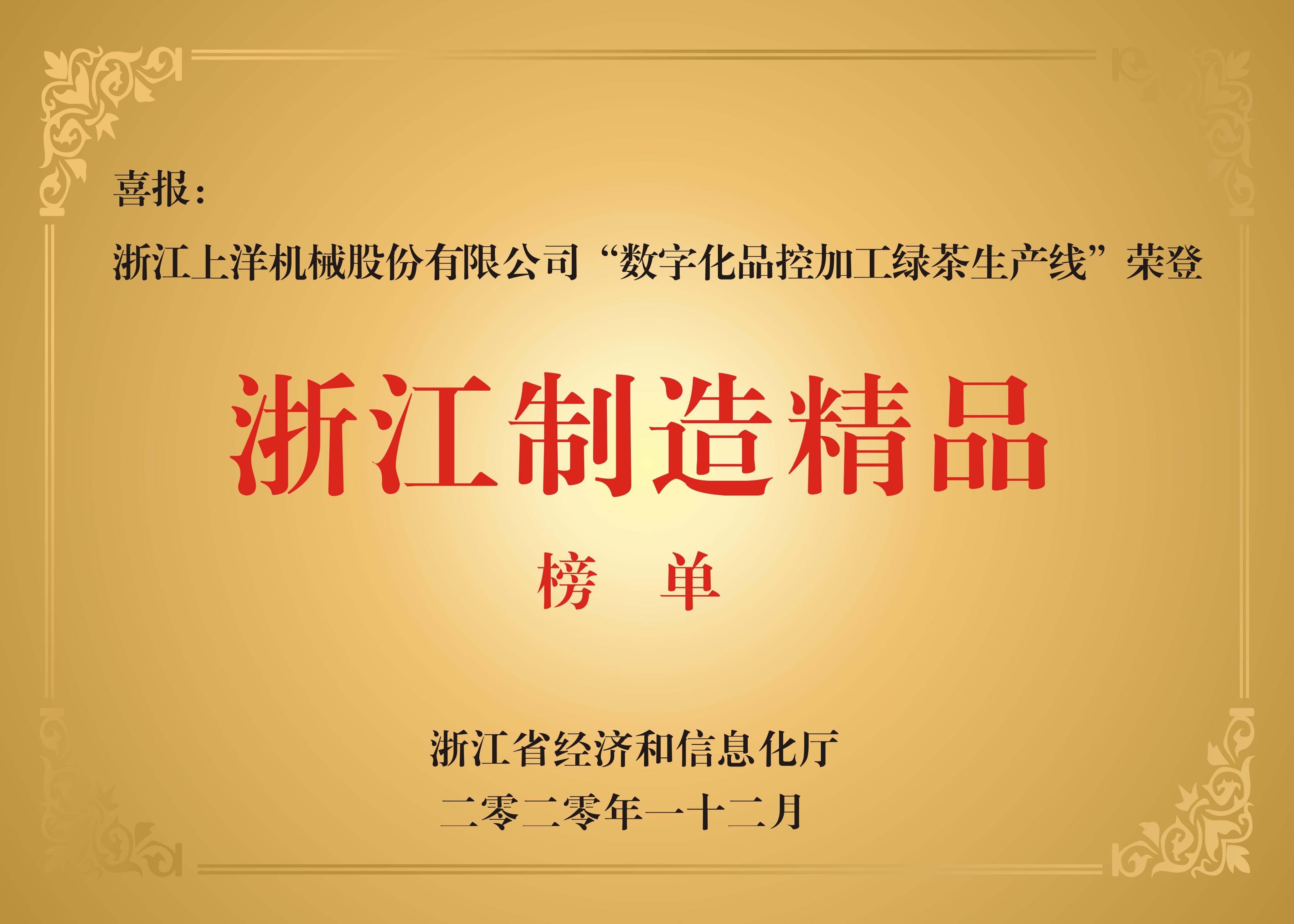 • 2020年, “6CRK-55茶葉揉捻機”獲“浙江制造品字標”認證榮譽,“數字化品控加工綠茶生產線”榮登“浙江制造精品”榜單。