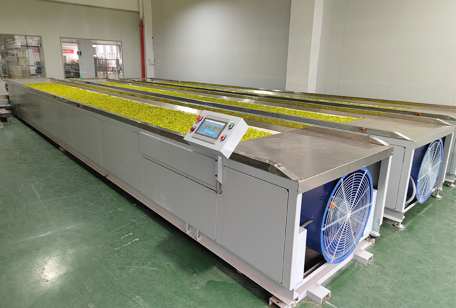 作業(yè)原理:單層式結構,機組采用的集中控制系統(tǒng)可精準控制鼓風時間、風量、溫度、攤?cè)~厚度/重量等主要參數(shù),實現(xiàn)攤青(萎凋)的均勻充分。 利用光電定位系統(tǒng),能有效檢測茶葉流量,可自動控制茶葉進入下一步工藝流程。